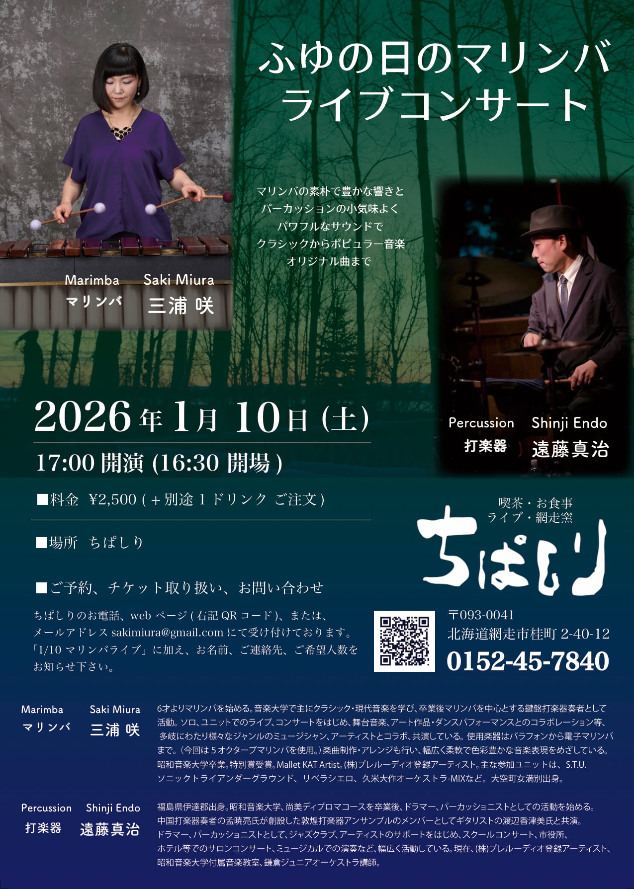 今年で3回目となるちぱしりでは珍しいクラシック中心のコンサート。網走近郊のコンサートもブッキングし大変好評でした。